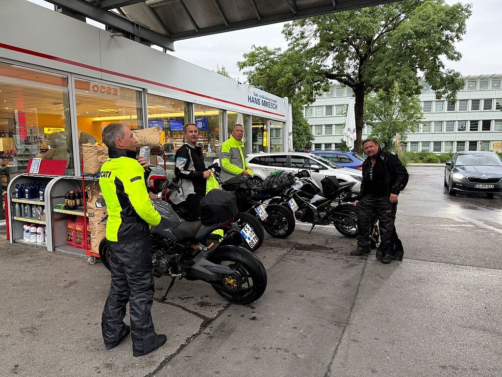 Servus Café-Onkels und Tanten, wir waren vom 04. bis 08. Juli 5 Tage on Tour: Start am Flughafen München, AT, SLO, HR, IT, AT und zurück nach DE. In Summe knapp 1.800km, davon gut 400km im Monsun. Ab Start München war der Felbertauerntunnel die Wetterscheide. Danach wars 4 Tage trocken, ehe wir die letzte Etapppe in Meran/Algund nach Hause starteten. Am 08. Juli schwammen wir dann auf dem Rückweg ab Innsbruck übern Zirler Berg, Garmisch bis nach Landsberg a. Lech. Von da ab wars bis München wieder trocken. Dass es trotzdem geil war, sieht man auf ein paar ausgewählten Bildern ganz gut. Hier die Tour, die für zwei unserer Mitstreiter in der Nähe von Reutlingen begann. Sie reisten bereits am 03.07. am Abend nach München an. Start in Naßklamotten am Munich Airport Freitagfrüh um 06:15 Uhr. Raus ausm Felbertauerntunnel und die Regenpelle eingepackt. ☀️ Ankunft ersten tollen Hotel in Kozina. Mit Stellplätzen genau nach unserer Kragenweite. 🏆 Dann weiter zum Hotel Villa Marica in Sveti Juraj Sonst war ja wirklich nichts los in Tarcento. Weder im Hotel Albegro Centrale und kaum Leute auf der Straße. Logo, die lagen alle beim poppen in der Kiste. 😂👉👌 Letzten Abend genießen im Pool am Hotel Gstör in Meran/Algund. Eine unserer Stammdestinationen.22 points