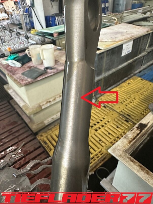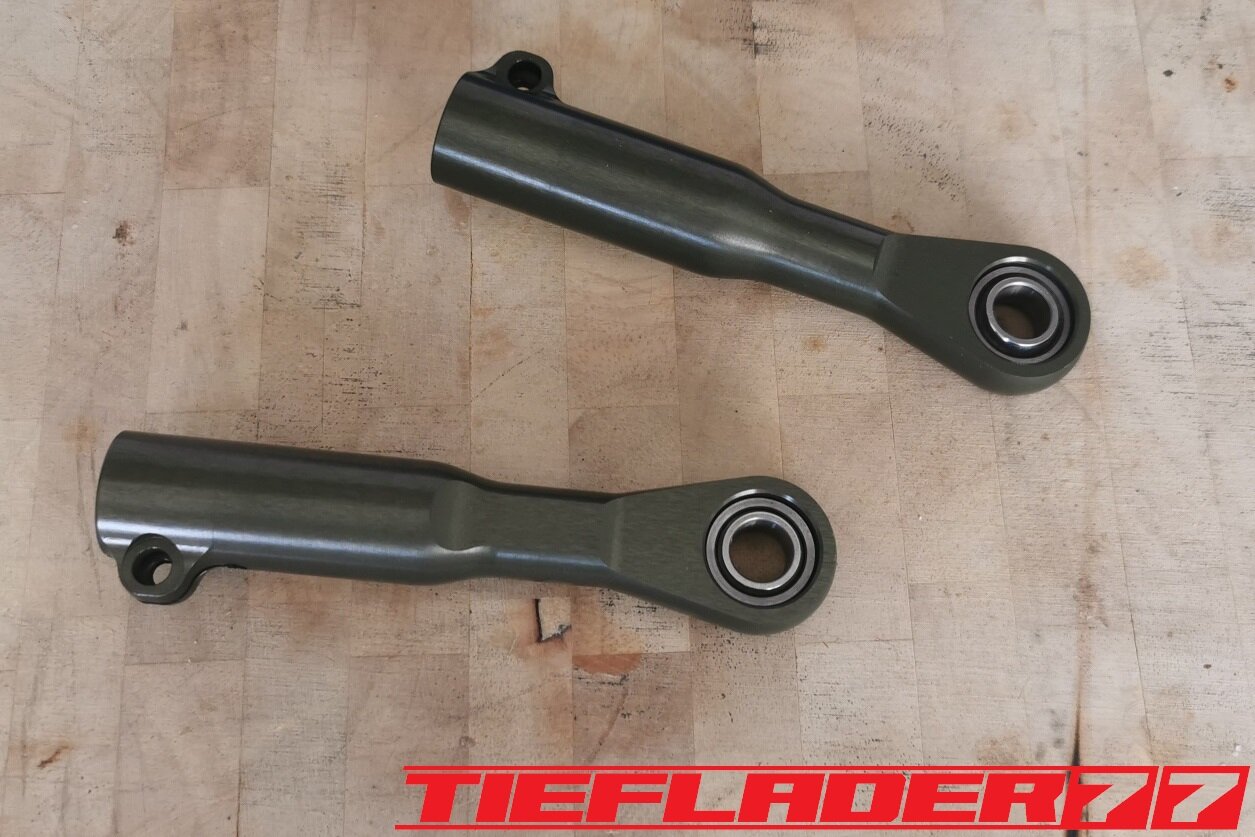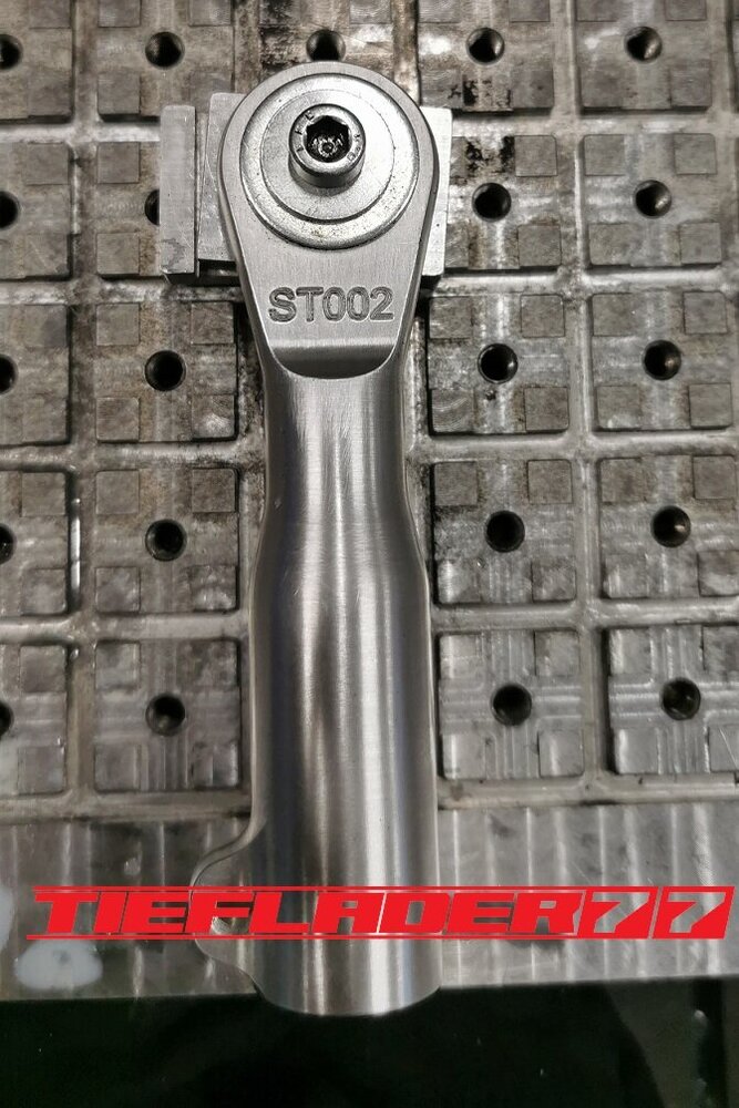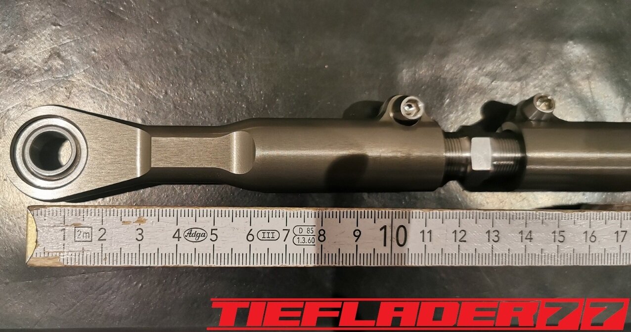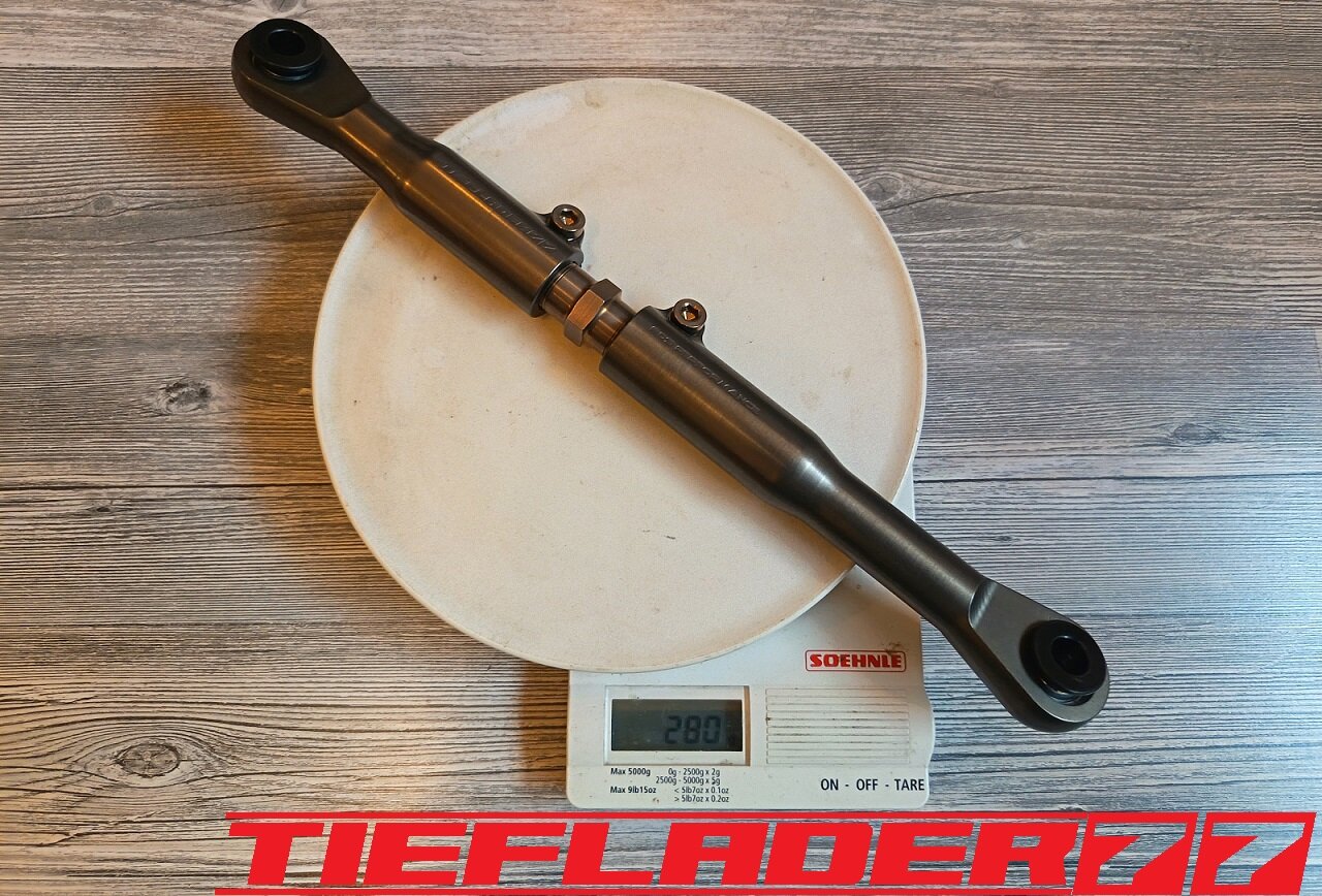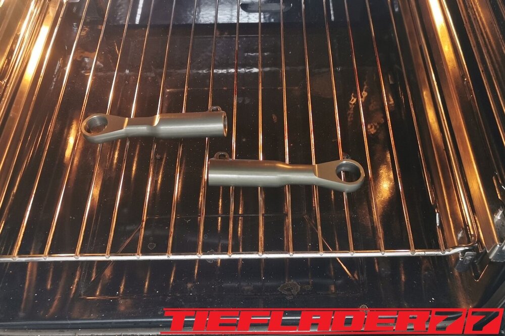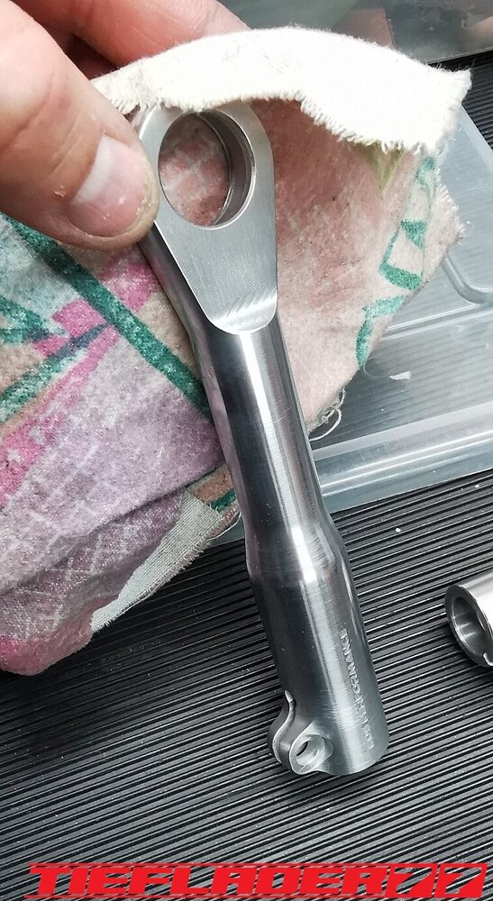 Der nun 3te Versuch war nicht weniger Nervenaufreibend.... Man lernt halt nie aus... Also alles von vorne. Material besorgen. Einspannen, fräsen....geht beim 3ten mal schon viel schneller.(Ironie off) Als die Schubstrebe vom eloxieren zurückkam, habe ich die Lager eingepresst. Bisher hatte ich immer die Lager ins Eisfach gelegt und die Aluteile in den vorgeheizten Backofen gelegt, damit die Lager besser hineingehen. Nun ja, nach dem Einpressen der Lager fühlte sich die Oberfläche etwas rau an. Bei näherem Hinsehen war ich sehr erstaunt, das die Eloxalschicht etwas abblätterte. Ich habe einen tollen Temperaturschaden produziert. Mein Eloxierer fragte auf wie viel Grad das ganze geheizt wurde, da Eloxal bei ca. 120° zerstört wird. Harteloxal kann etwas mehr Temperatur vertragen... Mit dieser neuen Erkenntnis hätte ich schon fast das Projekt hingeschmissen.🤮 Mein Eloxierer sah es eher skeptisch, die Schubstrebe nochmal hinzubekommen. Trotzdem wollte ich das ganze versuchen.🤷♂️ Wir haben dann das ganze enteloxiert und ich habe versucht, das ganze aufzuarbeiten. Man konnte den Schaden an der Oberfläche gut erkennen. Ich habe das ganze mal Gleitgeschliffen und dann noch weiter aufpoliert. Das sah schon wieder gut aus. Gleichzeitig habe ich die Schubstrebe für den TÜV graviert, da dieser eine Bezeichnung sehen wollte. Erst einspannen, vermessen und dann gravieren. Das ganze sah schon richtig gut aus. Hier ein Video davon. VID_20240127_190943.mp4 Nach dem eloxieren dann die positive Überraschung. Der Aufwand hatte sich gelohnt. Das Neu eloxieren hatte geklappt und nun wurde das Lager ohne Temperatur neu eingepresst. Die Titanteile habe ich alle noch in Bronze light anodisiert. Ich hab es selbst nicht mehr geglaubt, aber alle guten Dinge sind 3. Nach der letzten Hürde war nun die Schubstrebe endlich fertig geworden. Natürlich kam wieder ein Gewichtsvergleich. OEM Schubstrebe 336 gr. Tieflader Schubstrebe 280 gr. ------------------------------------- Ersparnis 56 gr. Satte 56 gr. konnte ich trotz mehrteiliger Schubstrebe einsparen.🤩 Chapeau, Prost