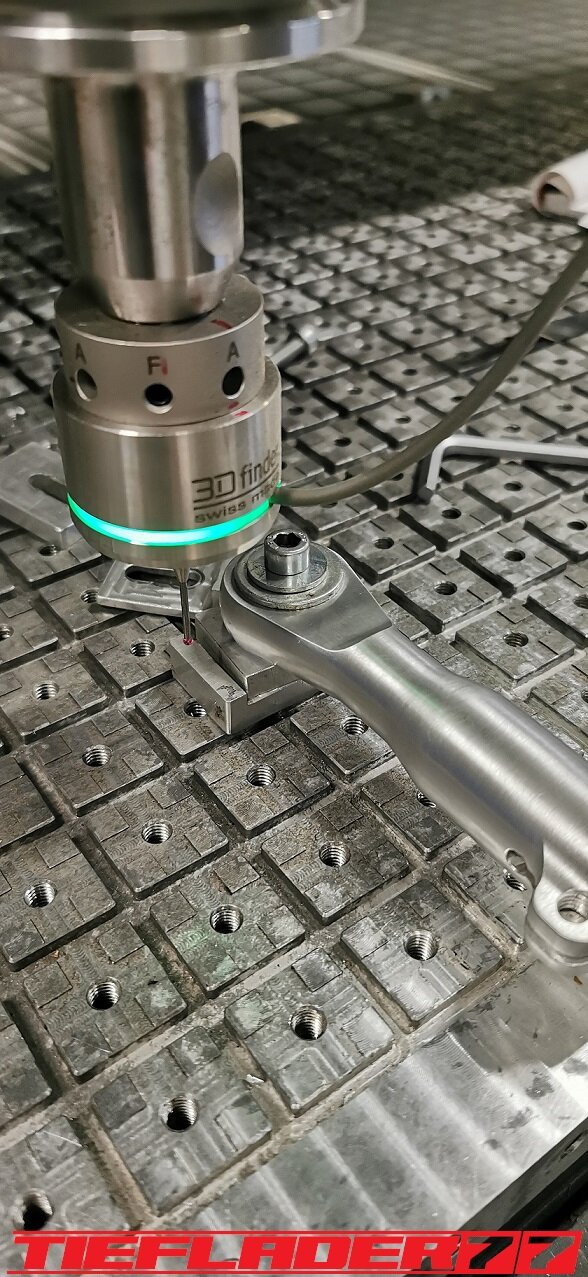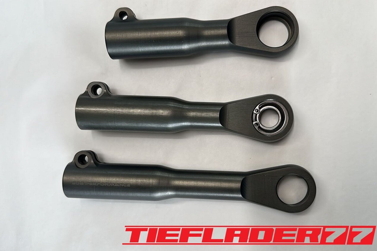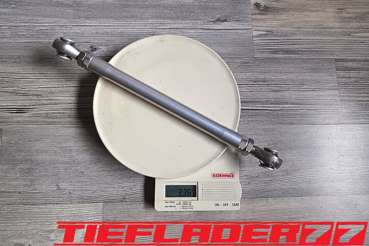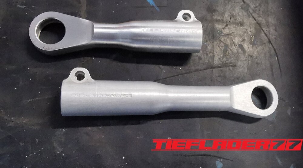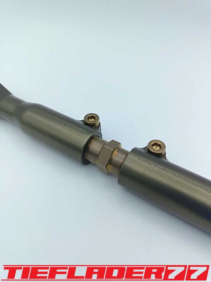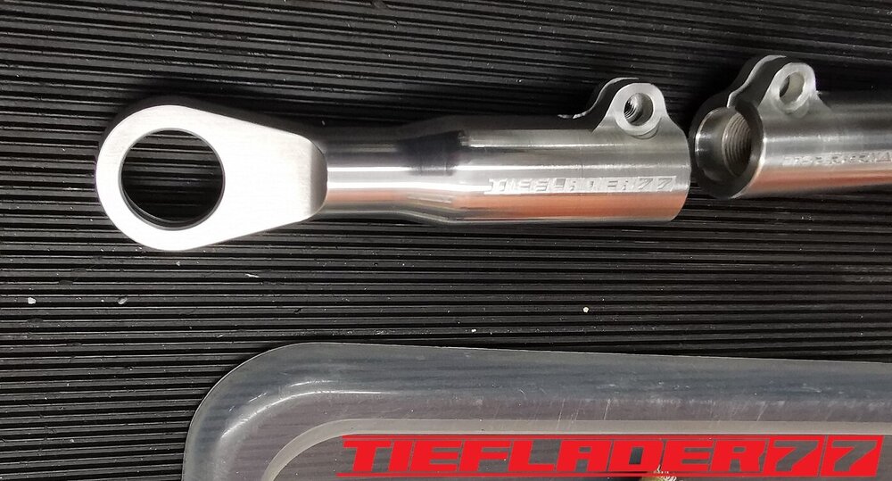 Der nun 3te Versuch war nicht weniger Nervenaufreibend.... Man lernt halt nie aus... Also alles von vorne. Material besorgen. Einspannen, fräsen....geht beim 3ten mal schon viel schneller.(Ironie off) Als die Schubstrebe vom eloxieren zurückkam, habe ich die Lager eingepresst. Bisher hatte ich immer die Lager ins Eisfach gelegt und die Aluteile in den vorgeheizten Backofen gelegt, damit die Lager besser hineingehen. Nun ja, nach dem Einpressen der Lager fühlte sich die Oberfläche etwas rau an. Bei näherem Hinsehen war ich sehr erstaunt, das die Eloxalschicht etwas abblätterte. Ich habe einen tollen Temperaturschaden produziert. Mein Eloxierer fragte auf wie viel Grad das ganze geheizt wurde, da Eloxal bei ca. 120° zerstört wird. Harteloxal kann etwas mehr Temperatur vertragen... Mit dieser neuen Erkenntnis hätte ich schon fast das Projekt hingeschmissen.🤮 Mein Eloxierer sah es eher skeptisch, die Schubstrebe nochmal hinzubekommen. Trotzdem wollte ich das ganze versuchen.🤷♂️ Wir haben dann das ganze enteloxiert und ich habe versucht, das ganze aufzuarbeiten. Man konnte den Schaden an der Oberfläche gut erkennen. Ich habe das ganze mal Gleitgeschliffen und dann noch weiter aufpoliert. Das sah schon wieder gut aus. Gleichzeitig habe ich die Schubstrebe für den TÜV graviert, da dieser eine Bezeichnung sehen wollte. Erst einspannen, vermessen und dann gravieren. Das ganze sah schon richtig gut aus. Hier ein Video davon. VID_20240127_190943.mp4 Nach dem eloxieren dann die positive Überraschung. Der Aufwand hatte sich gelohnt. Das Neu eloxieren hatte geklappt und nun wurde das Lager ohne Temperatur neu eingepresst. Die Titanteile habe ich alle noch in Bronze light anodisiert. Ich hab es selbst nicht mehr geglaubt, aber alle guten Dinge sind 3. Nach der letzten Hürde war nun die Schubstrebe endlich fertig geworden. Natürlich kam wieder ein Gewichtsvergleich. OEM Schubstrebe 336 gr. Tieflader Schubstrebe 280 gr. ------------------------------------- Ersparnis 56 gr. Satte 56 gr. konnte ich trotz mehrteiliger Schubstrebe einsparen.🤩 Chapeau, Prost