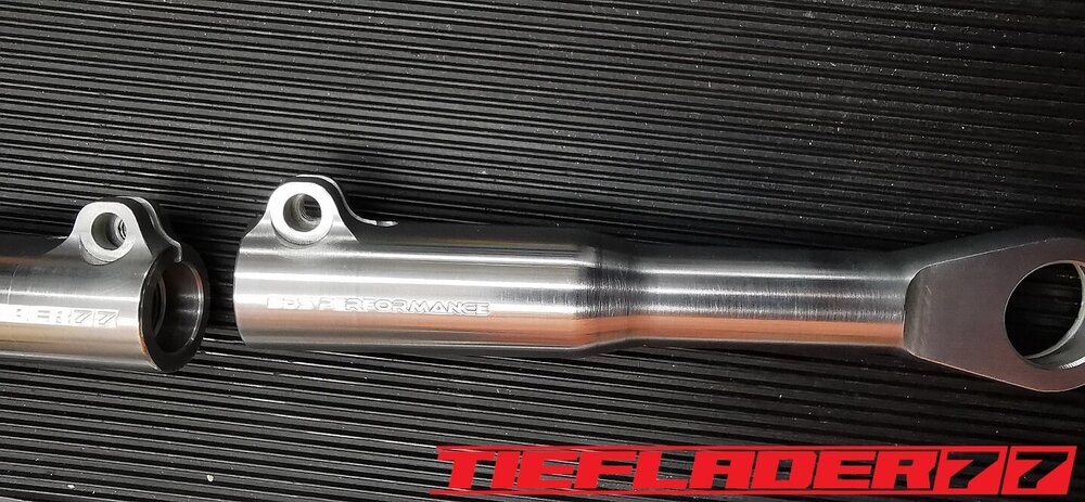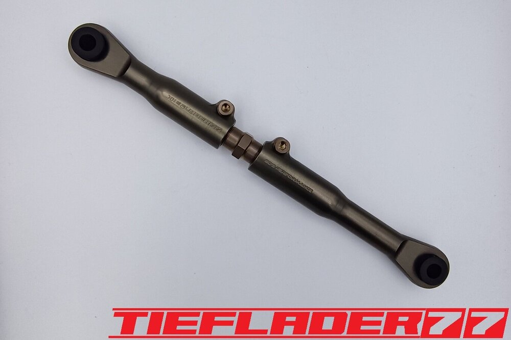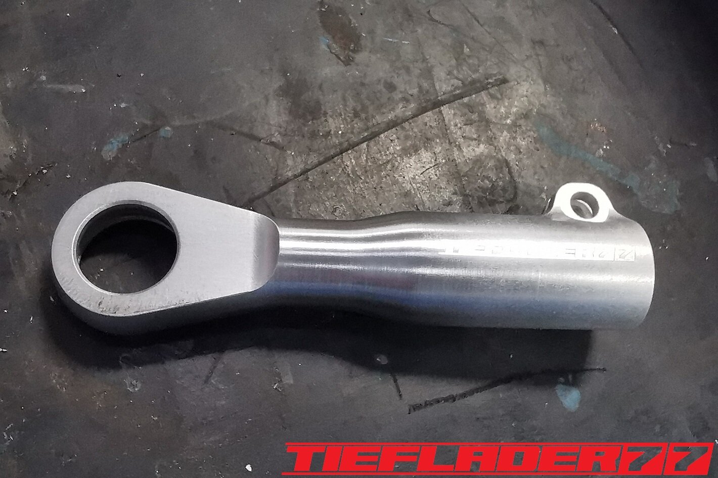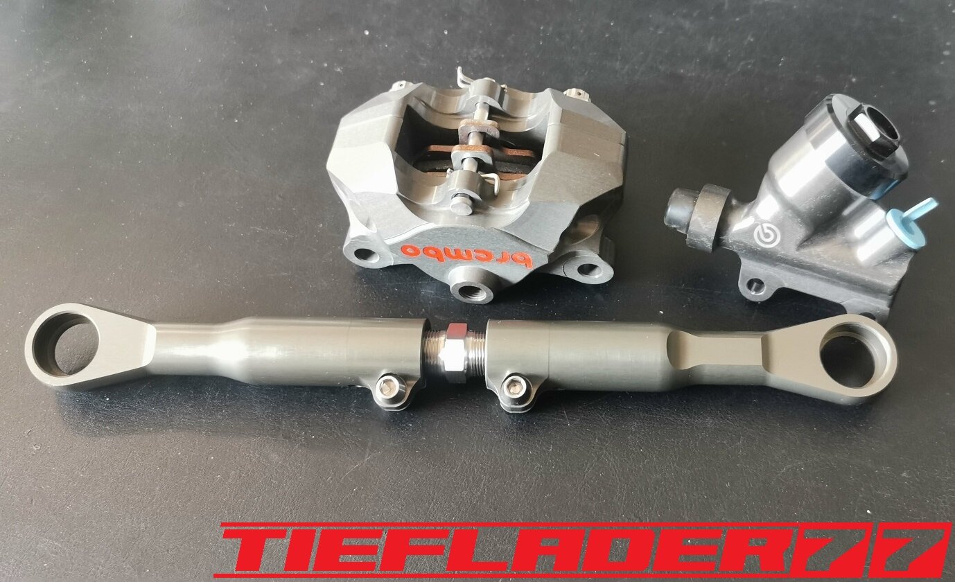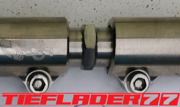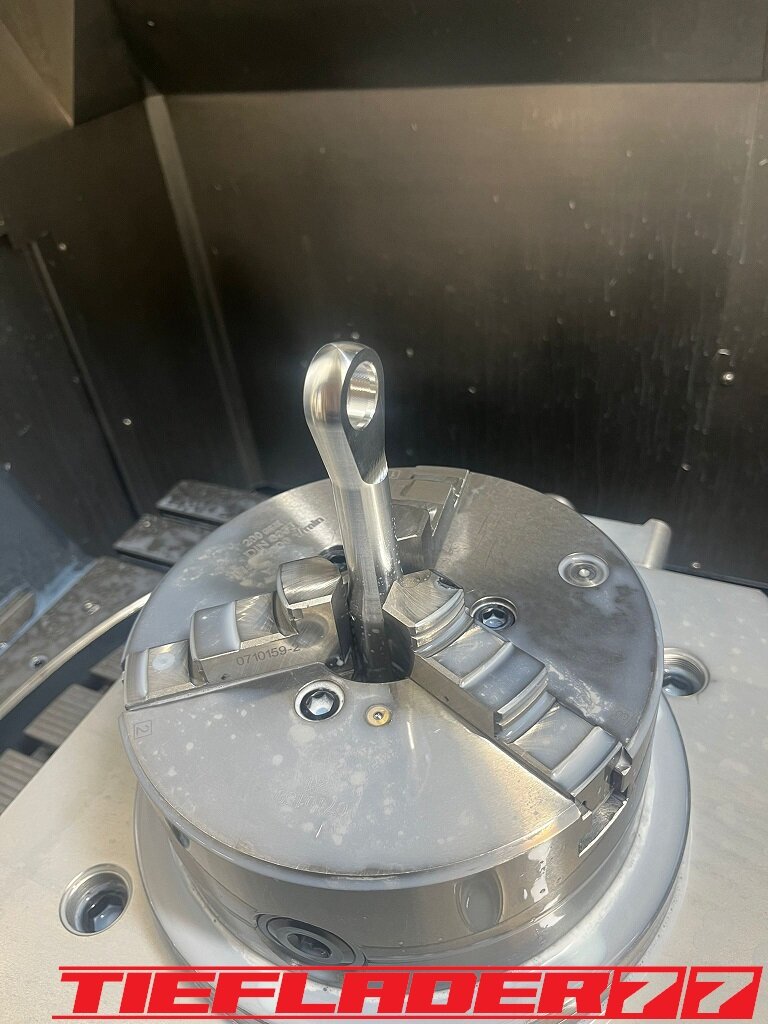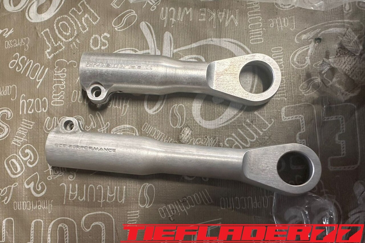 Der nun 3te Versuch war nicht weniger Nervenaufreibend.... Man lernt halt nie aus... Also alles von vorne. Material besorgen. Einspannen, fräsen....geht beim 3ten mal schon viel schneller.(Ironie off) Als die Schubstrebe vom eloxieren zurückkam, habe ich die Lager eingepresst. Bisher hatte ich immer die Lager ins Eisfach gelegt und die Aluteile in den vorgeheizten Backofen gelegt, damit die Lager besser hineingehen. Nun ja, nach dem Einpressen der Lager fühlte sich die Oberfläche etwas rau an. Bei näherem Hinsehen war ich sehr erstaunt, das die Eloxalschicht etwas abblätterte. Ich habe einen tollen Temperaturschaden produziert. Mein Eloxierer fragte auf wie viel Grad das ganze geheizt wurde, da Eloxal bei ca. 120° zerstört wird. Harteloxal kann etwas mehr Temperatur vertragen... Mit dieser neuen Erkenntnis hätte ich schon fast das Projekt hingeschmissen.🤮 Mein Eloxierer sah es eher skeptisch, die Schubstrebe nochmal hinzubekommen. Trotzdem wollte ich das ganze versuchen.🤷♂️ Wir haben dann das ganze enteloxiert und ich habe versucht, das ganze aufzuarbeiten. Man konnte den Schaden an der Oberfläche gut erkennen. Ich habe das ganze mal Gleitgeschliffen und dann noch weiter aufpoliert. Das sah schon wieder gut aus. Gleichzeitig habe ich die Schubstrebe für den TÜV graviert, da dieser eine Bezeichnung sehen wollte. Erst einspannen, vermessen und dann gravieren. Das ganze sah schon richtig gut aus. Hier ein Video davon. VID_20240127_190943.mp4 Nach dem eloxieren dann die positive Überraschung. Der Aufwand hatte sich gelohnt. Das Neu eloxieren hatte geklappt und nun wurde das Lager ohne Temperatur neu eingepresst. Die Titanteile habe ich alle noch in Bronze light anodisiert. Ich hab es selbst nicht mehr geglaubt, aber alle guten Dinge sind 3. Nach der letzten Hürde war nun die Schubstrebe endlich fertig geworden. Natürlich kam wieder ein Gewichtsvergleich. OEM Schubstrebe 336 gr. Tieflader Schubstrebe 280 gr. ------------------------------------- Ersparnis 56 gr. Satte 56 gr. konnte ich trotz mehrteiliger Schubstrebe einsparen.🤩 Chapeau, Prost
