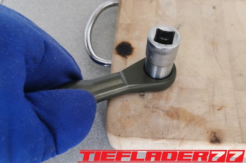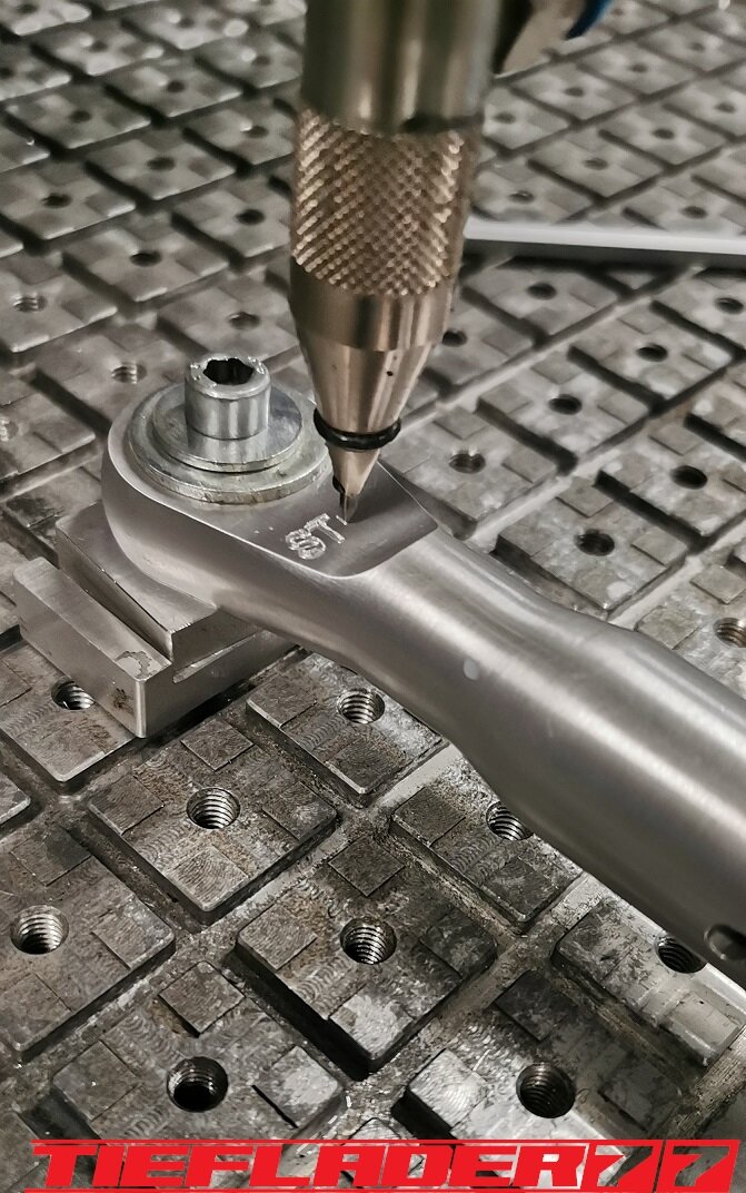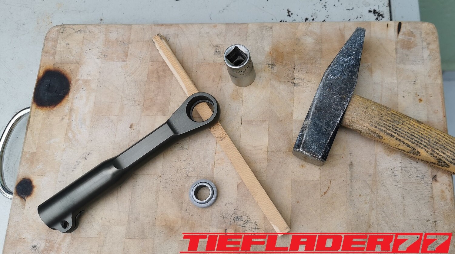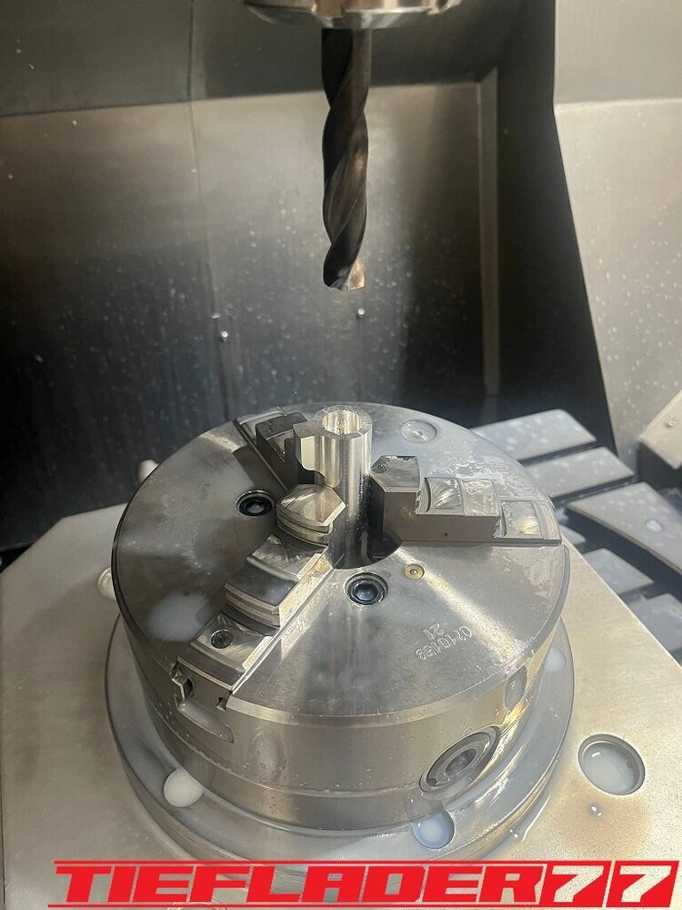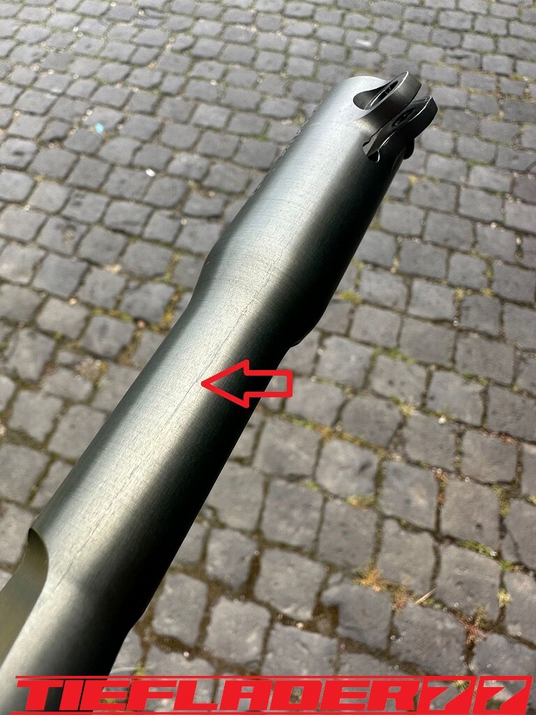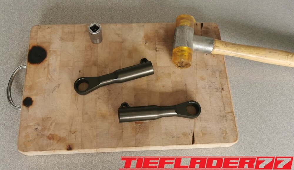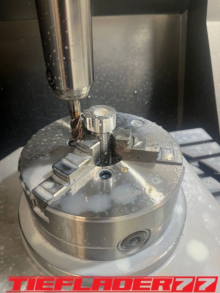 Der nun 3te Versuch war nicht weniger Nervenaufreibend.... Man lernt halt nie aus... Also alles von vorne. Material besorgen. Einspannen, fräsen....geht beim 3ten mal schon viel schneller.(Ironie off) Als die Schubstrebe vom eloxieren zurückkam, habe ich die Lager eingepresst. Bisher hatte ich immer die Lager ins Eisfach gelegt und die Aluteile in den vorgeheizten Backofen gelegt, damit die Lager besser hineingehen. Nun ja, nach dem Einpressen der Lager fühlte sich die Oberfläche etwas rau an. Bei näherem Hinsehen war ich sehr erstaunt, das die Eloxalschicht etwas abblätterte. Ich habe einen tollen Temperaturschaden produziert. Mein Eloxierer fragte auf wie viel Grad das ganze geheizt wurde, da Eloxal bei ca. 120° zerstört wird. Harteloxal kann etwas mehr Temperatur vertragen... Mit dieser neuen Erkenntnis hätte ich schon fast das Projekt hingeschmissen.🤮 Mein Eloxierer sah es eher skeptisch, die Schubstrebe nochmal hinzubekommen. Trotzdem wollte ich das ganze versuchen.🤷♂️ Wir haben dann das ganze enteloxiert und ich habe versucht, das ganze aufzuarbeiten. Man konnte den Schaden an der Oberfläche gut erkennen. Ich habe das ganze mal Gleitgeschliffen und dann noch weiter aufpoliert. Das sah schon wieder gut aus. Gleichzeitig habe ich die Schubstrebe für den TÜV graviert, da dieser eine Bezeichnung sehen wollte. Erst einspannen, vermessen und dann gravieren. Das ganze sah schon richtig gut aus. Hier ein Video davon. VID_20240127_190943.mp4 Nach dem eloxieren dann die positive Überraschung. Der Aufwand hatte sich gelohnt. Das Neu eloxieren hatte geklappt und nun wurde das Lager ohne Temperatur neu eingepresst. Die Titanteile habe ich alle noch in Bronze light anodisiert. Ich hab es selbst nicht mehr geglaubt, aber alle guten Dinge sind 3. Nach der letzten Hürde war nun die Schubstrebe endlich fertig geworden. Natürlich kam wieder ein Gewichtsvergleich. OEM Schubstrebe 336 gr. Tieflader Schubstrebe 280 gr. ------------------------------------- Ersparnis 56 gr. Satte 56 gr. konnte ich trotz mehrteiliger Schubstrebe einsparen.🤩 Chapeau, Prost