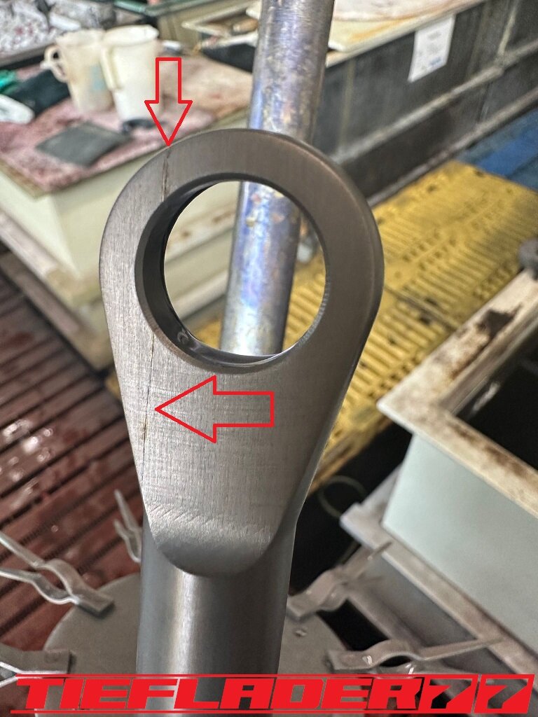 @nilo der Platz am Krümmer kommt ja auch immer auf den Krümmer an und der Stellung der Wippe (länge Schubstrebe) Das ist generell schon eine Engstelle,ja Uneingefedert habe ich da ca. 6-8mm Schubstrebe 2ter Versuch Beim 2ten Versuch wurden einige Dinge geändert. So ein Projekt entwickelt sich. Die Schrauben an der Klemmung saßen auf der verkehrten Seite und wurden dann quasi gedreht (180°). Die Hohlschraube bekam wie die NCR Strebe einen Teilbereich ohne Gewinde, welches dann ein Stück in der Schubstrebe verschwindet. Das ganze dann also nochmal vermessen und den unteren Teil verlängert. Da das ganze nicht einfach einzeln eloxiert werden kann, da höchstwahrscheinlich Farbunterschiede entstanden wären, musste natürlich Ober- und Unterteil neu gemacht werden. Das Ziel war zum Greifen Nah... Ab zum Eloxierer. Leider kam dann schon die schlechte Nachricht. Bereits während des Eloxalvorgangs konnte man erkennen, dass die untere Schubstrebe einen Materialfehler hatte. Sowas ist sehr, sehr selten und trotzdem Real. Zum Kotzen... Das ganze Teil war Ausschuss. Der Haarriss zog sich längs durch das ganze Material. Jetzt hatte ich zwar die richtige Länge, aber leider ein Ausschussteil....... Nächster Versuch....🤢🤯