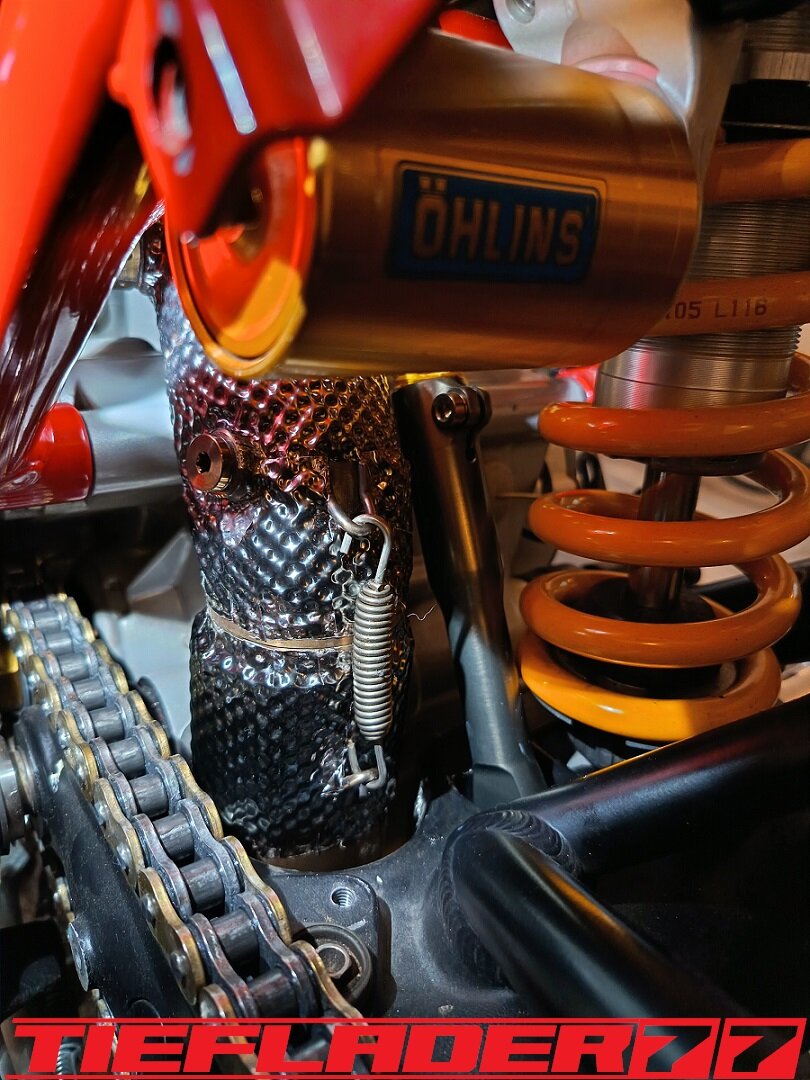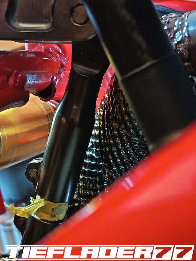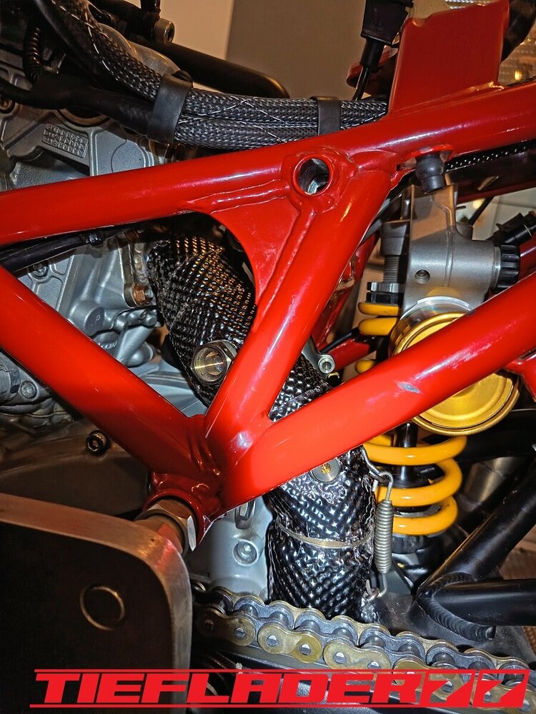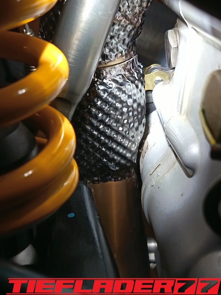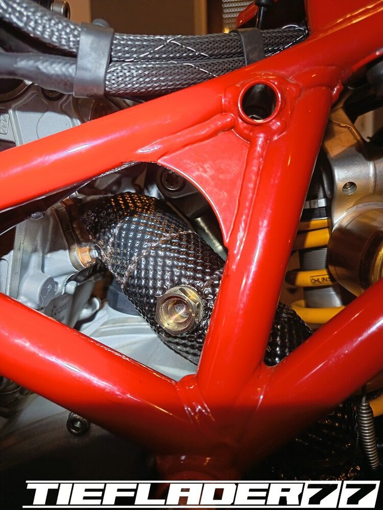 Das ganze habe ich dann endlich mal für den TÜV zusammen führen wollen. Soweit so gut. Alles ziemlicher Fummelskram. Alle Schrauben mit Antiseizepaste eingeschmiert. Um das Axialspiel zu reduzieren habe ich da wo es nötig ist dünne Edelstahl Passscheiben eingesetzt. Was man jetzt gut erkennen kann, die sehr engen Platzverhältnisse. Da ich bezüglich des Hitzeschadens (Eloxalschadens) sehr geprägt bin, ist die Sorge groß, das ganze mit so engen Platzverhältnissen zu betreiben. An den engsten Stellen sind gerade mal 8 mm zum Krümmer. Wie heiß wird so ein Krümmer an der Ausgangsseite vom Kopf? 400-500-600 ° ? Wie viel auch immer, wenn das Eloxal bereits nach ca. 120° die Grätsche macht, ist mir das Risiko einfach zu groß. Wie schon erwähnt, hab ich nach Lösungen gesucht für dieses Problem. Hier sieht man jetzt auch das hausgemachte Problem, wenn man statt eines 44,5 mm Krümmers, einen 54 mm Krümmer verbaut. Ich habe mich dann für den 6 mm Thermo Tech Schutz entschieden. Ich hab schon befürchtet, dass das alles eine sehr knappe Kiste wird, leider gibt es keine Alternative oder man müsste die Schubstrebe aus Titan bauen... Ich habe dann sehr viele Bilder im eingebauten Zustand gesendet und alles genauestens geschrieben, denn an einigen Stellen darf kein Hitzeschutz auftragen, da sonst der Krümmer ans Motorgehäuse kommt. Ebenfalls darf der Hitzeschutz nicht zu nah am Krümmerflansch befestigt werden, da man sonst die Muttern nicht mehr darauf bekommt. Ebenfalls ist das Schwingenauge eine Problemstelle. Der Hitzeschutz soll somit nur den Bereich abdecken zwischen Zylinderkopf Ausgang und Eingang Schwingenauge. Die Aufgabenstellung war ganz eindeutig gestellt und alle Bereiche genauestens beschrieben wie z.B. hier, Ich wollte, das ganze nochmal telefonisch besprechen, damit alles klar ist... wollte da aber keiner. Irgendwann kam dann eine Mail an, das alles fertig war. 🤢😳 Ich brauchte einen Moment um zu realisieren was da schiefgelaufen war.... Das war eine ziemlich Blutdruck steigernde Situation. Es wurde am Krümmer genau das Krümmerstück eingepackt, was frei bleiben sollte. Was ein Mist... Zum Glück wurde das alles schnell abgeändert. Ich hatte Bedenken, das da noch sichtbare Restbestände am Krümmer waren. So war es auch gewesen. Musste hier nochmal nacharbeiten, um alle Spuren zu beseitigen. Der Auftrag hatte für mich ein gemischtes Gefühl... Nun ist das ganze fertig und sieht wie folgt aus. Ich hatte mich für schwarzes Kalottenblech entschieden. Na ja, schwarz ist das nicht. Eher Titan farbend / grau. Ist aber ok. Das Kalottenblech ist nur 0,1 mm dick und lässt sich eindrücken. Man muss vorsichtig sein damit. Der Einbau war wirklich eine Herausforderung. Das passte alles gerade so auf den Millimeter und nur durch größten aufwand. Die Duc musste auf den Motorständer, Schubstrebe musste gelöst werden. Alles sehr enge Platzverhältnisse. Solche Umbauten bestätigen definitiv, warum ich alle Teile erstmal zusammen stecke, bevor ich mit den Lackarbeiten anfange. Der Rahmen wäre schon zig mal beschädigt worden. Im eingebauten Zustand gefiel mir das richtig gut. Alles, wie ich es mir vorgestellt habe. Einige Stellen habe ich etwas eingedrückt, um genügend Abstand zu schaffen. Bin gespannt, wie sich das im Betrieb bemerkbar macht. Der Einbau durchs Schwingenauge ist fast gescheitert. Durch den großen Durchmesser und der einen Federhalterung ist das ganze fast gescheitert, dachte erst, ich muss die Schwinge lösen. Echt tricky. Ein aufwendiges Problem weniger. Ich muss mir noch einen spezialschlüssel bauen, um die Federbein Schubstrebe einstellen zu können.