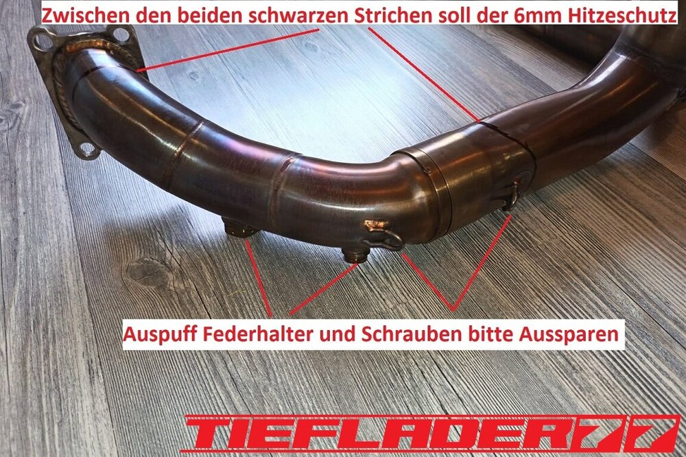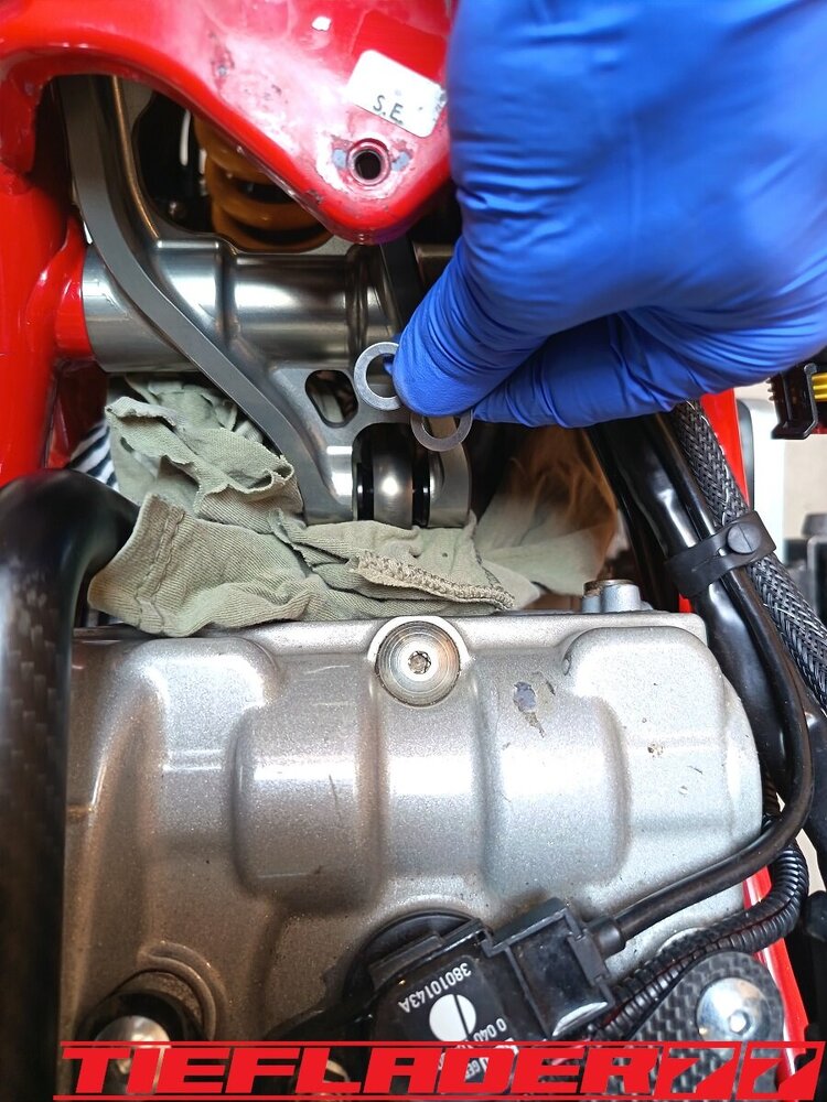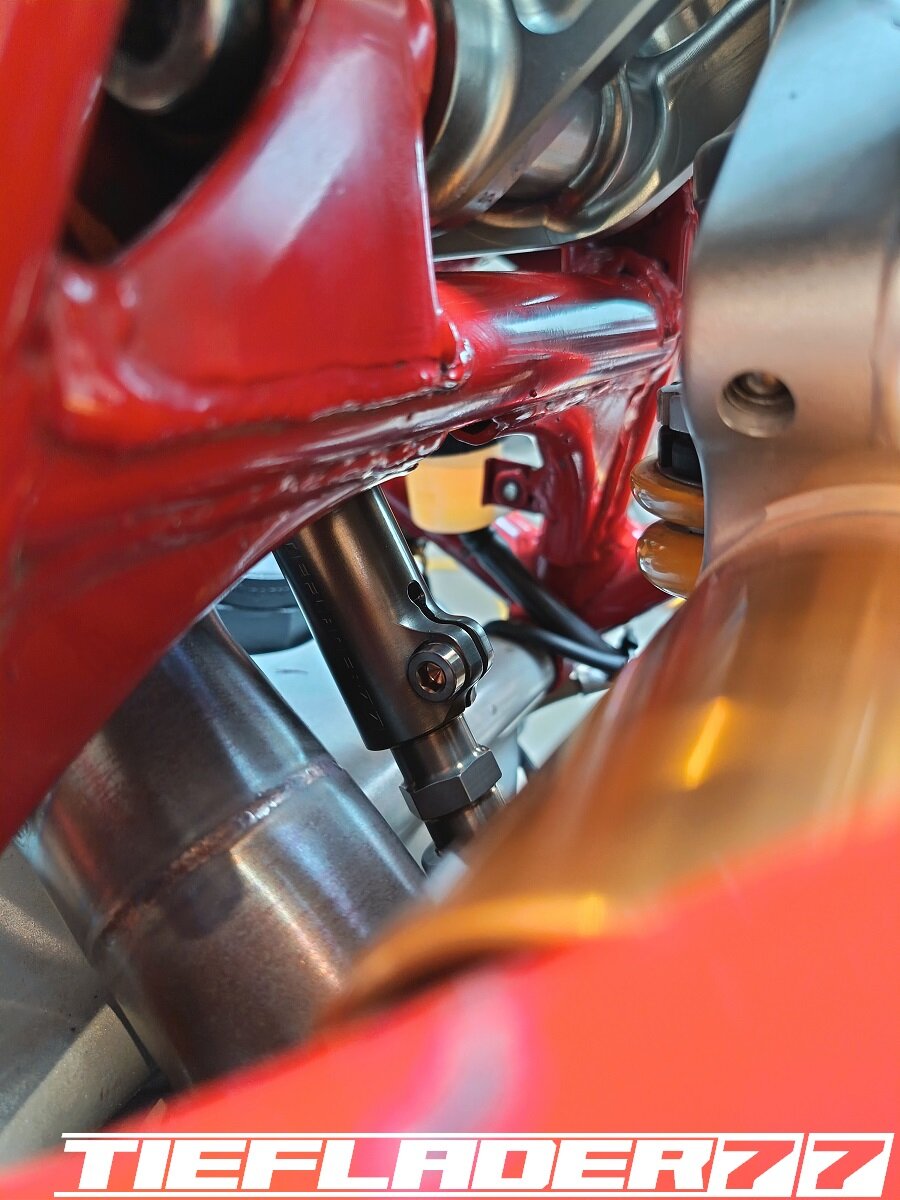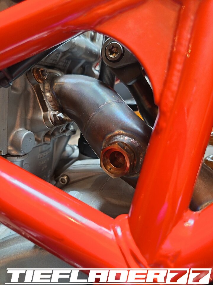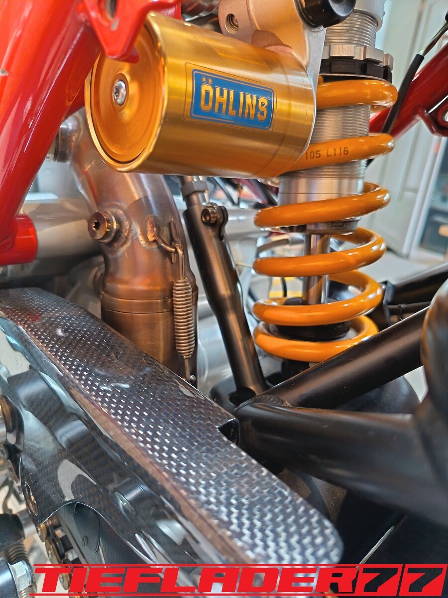 Das ganze habe ich dann endlich mal für den TÜV zusammen führen wollen. Soweit so gut. Alles ziemlicher Fummelskram. Alle Schrauben mit Antiseizepaste eingeschmiert. Um das Axialspiel zu reduzieren habe ich da wo es nötig ist dünne Edelstahl Passscheiben eingesetzt. Was man jetzt gut erkennen kann, die sehr engen Platzverhältnisse. Da ich bezüglich des Hitzeschadens (Eloxalschadens) sehr geprägt bin, ist die Sorge groß, das ganze mit so engen Platzverhältnissen zu betreiben. An den engsten Stellen sind gerade mal 8 mm zum Krümmer. Wie heiß wird so ein Krümmer an der Ausgangsseite vom Kopf? 400-500-600 ° ? Wie viel auch immer, wenn das Eloxal bereits nach ca. 120° die Grätsche macht, ist mir das Risiko einfach zu groß. Wie schon erwähnt, hab ich nach Lösungen gesucht für dieses Problem. Hier sieht man jetzt auch das hausgemachte Problem, wenn man statt eines 44,5 mm Krümmers, einen 54 mm Krümmer verbaut. Ich habe mich dann für den 6 mm Thermo Tech Schutz entschieden. Ich hab schon befürchtet, dass das alles eine sehr knappe Kiste wird, leider gibt es keine Alternative oder man müsste die Schubstrebe aus Titan bauen... Ich habe dann sehr viele Bilder im eingebauten Zustand gesendet und alles genauestens geschrieben, denn an einigen Stellen darf kein Hitzeschutz auftragen, da sonst der Krümmer ans Motorgehäuse kommt. Ebenfalls darf der Hitzeschutz nicht zu nah am Krümmerflansch befestigt werden, da man sonst die Muttern nicht mehr darauf bekommt. Ebenfalls ist das Schwingenauge eine Problemstelle. Der Hitzeschutz soll somit nur den Bereich abdecken zwischen Zylinderkopf Ausgang und Eingang Schwingenauge. Die Aufgabenstellung war ganz eindeutig gestellt und alle Bereiche genauestens beschrieben wie z.B. hier, Ich wollte, das ganze nochmal telefonisch besprechen, damit alles klar ist... wollte da aber keiner. Irgendwann kam dann eine Mail an, das alles fertig war. 🤢😳 Ich brauchte einen Moment um zu realisieren was da schiefgelaufen war.... Das war eine ziemlich Blutdruck steigernde Situation. Es wurde am Krümmer genau das Krümmerstück eingepackt, was frei bleiben sollte. Was ein Mist... Zum Glück wurde das alles schnell abgeändert. Ich hatte Bedenken, das da noch sichtbare Restbestände am Krümmer waren. So war es auch gewesen. Musste hier nochmal nacharbeiten, um alle Spuren zu beseitigen. Der Auftrag hatte für mich ein gemischtes Gefühl... Nun ist das ganze fertig und sieht wie folgt aus. Ich hatte mich für schwarzes Kalottenblech entschieden. Na ja, schwarz ist das nicht. Eher Titan farbend / grau. Ist aber ok. Das Kalottenblech ist nur 0,1 mm dick und lässt sich eindrücken. Man muss vorsichtig sein damit. Der Einbau war wirklich eine Herausforderung. Das passte alles gerade so auf den Millimeter und nur durch größten aufwand. Die Duc musste auf den Motorständer, Schubstrebe musste gelöst werden. Alles sehr enge Platzverhältnisse. Solche Umbauten bestätigen definitiv, warum ich alle Teile erstmal zusammen stecke, bevor ich mit den Lackarbeiten anfange. Der Rahmen wäre schon zig mal beschädigt worden. Im eingebauten Zustand gefiel mir das richtig gut. Alles, wie ich es mir vorgestellt habe. Einige Stellen habe ich etwas eingedrückt, um genügend Abstand zu schaffen. Bin gespannt, wie sich das im Betrieb bemerkbar macht. Der Einbau durchs Schwingenauge ist fast gescheitert. Durch den großen Durchmesser und der einen Federhalterung ist das ganze fast gescheitert, dachte erst, ich muss die Schwinge lösen. Echt tricky. Ein aufwendiges Problem weniger. Ich muss mir noch einen spezialschlüssel bauen, um die Federbein Schubstrebe einstellen zu können.