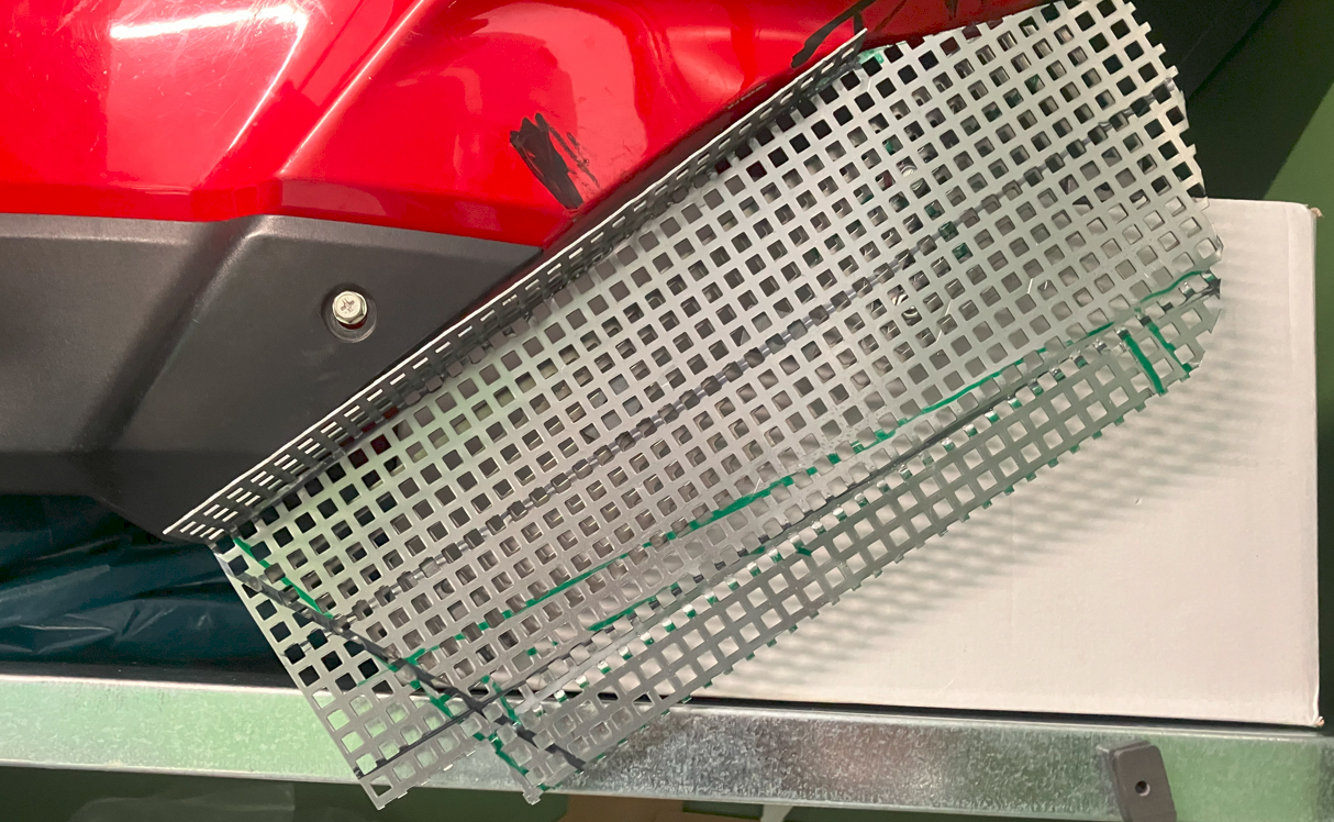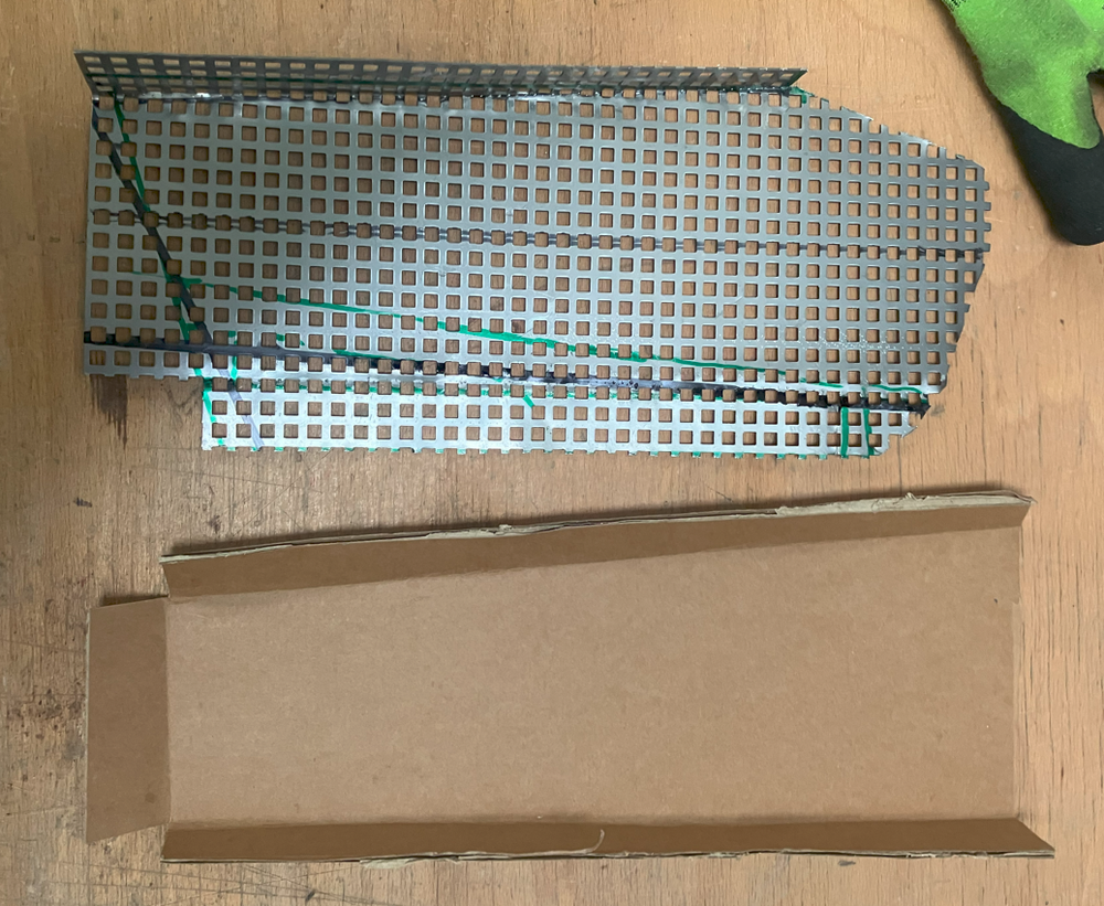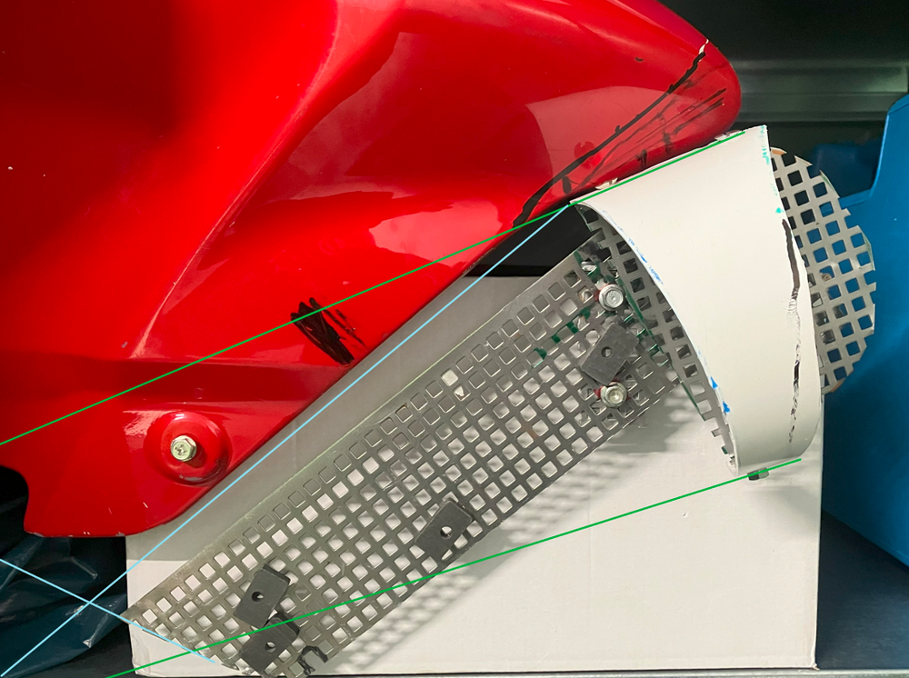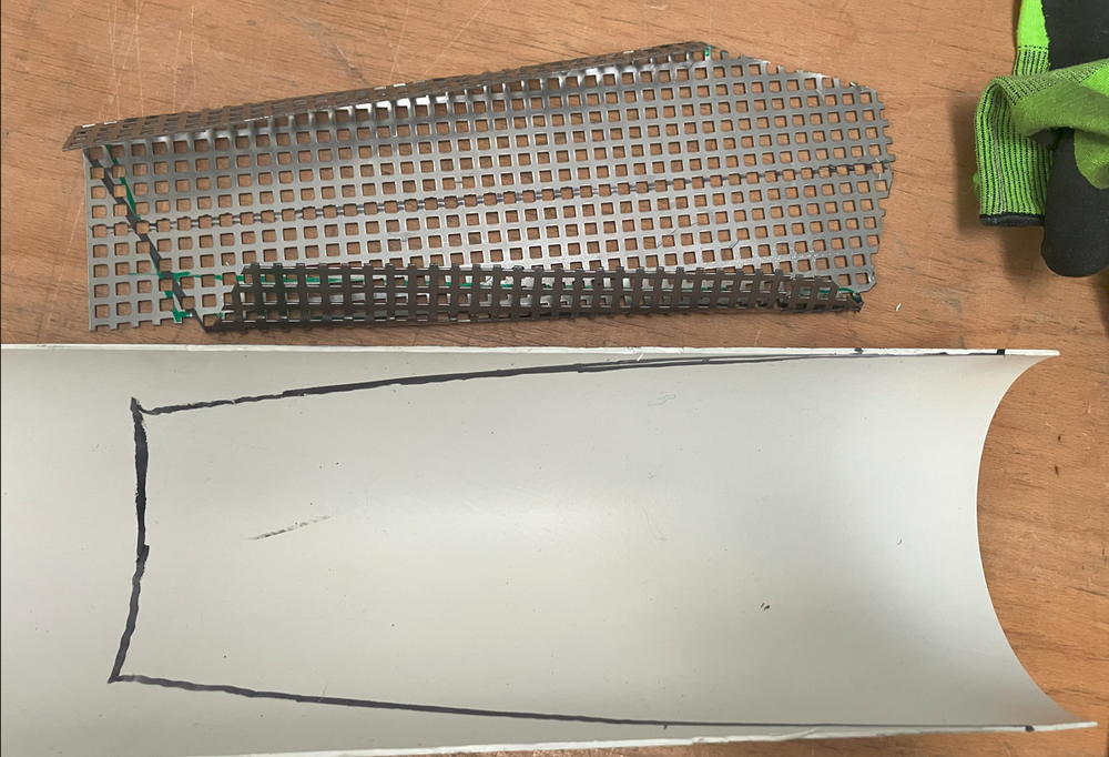 Das Teil angefügt, hat auch gepasst...(ohne Bild) Aber: Entlang der hellblauen Linie war das mir zu Schräg, Konzeptänderung auf "grüne Linie".. Mit einigen Anläufen konnte ein neues Halbrohr gut angepasst werden.... Immer noch aus einem Stück, die PVC Halbschablone lässt sich auch gut auf ein "halbes" 150er Alurohr übertragen.. Vorne erstmal viel Überstand; war ja noch nicht Thema... Trotzdem mal mit Gitter gespielt.... Um nicht nur auf eine Lösung fixiert zu sein noch eine Alternative in "Eckig" wie sie an jeder "Brot und Butter 125er" dran ist... Wohl einfacher auszuknobeln/zu planen/zu bemaßen aber aufwändiger Herzustellen ; Abkanten, dann sichtbare Nieten oder Schweißen....