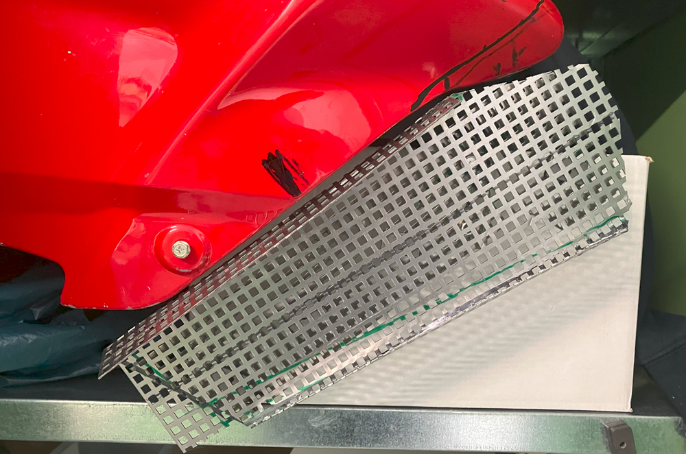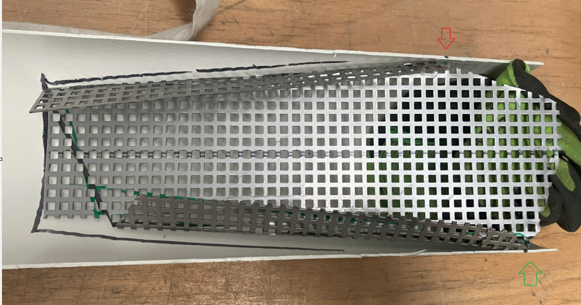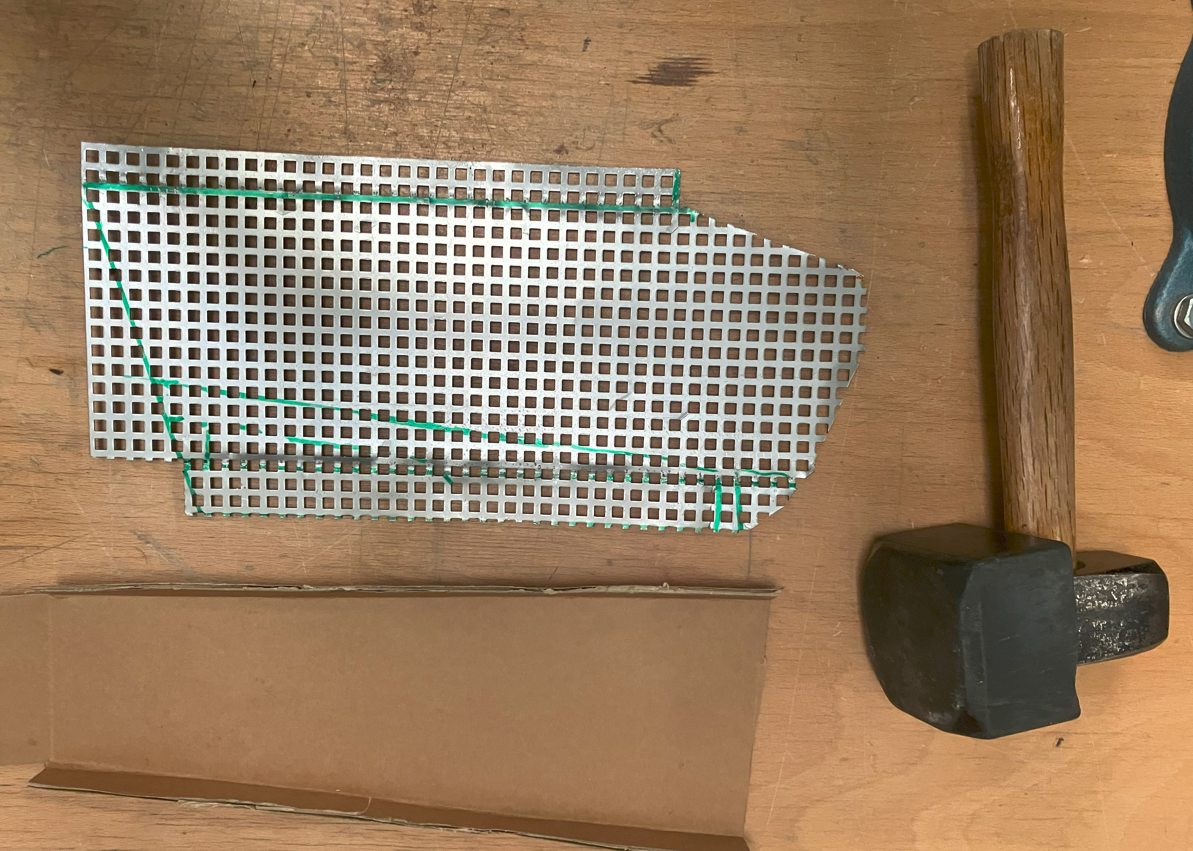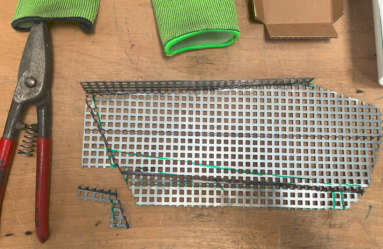 Das Teil angefügt, hat auch gepasst...(ohne Bild) Aber: Entlang der hellblauen Linie war das mir zu Schräg, Konzeptänderung auf "grüne Linie".. Mit einigen Anläufen konnte ein neues Halbrohr gut angepasst werden.... Immer noch aus einem Stück, die PVC Halbschablone lässt sich auch gut auf ein "halbes" 150er Alurohr übertragen.. Vorne erstmal viel Überstand; war ja noch nicht Thema... Trotzdem mal mit Gitter gespielt.... Um nicht nur auf eine Lösung fixiert zu sein noch eine Alternative in "Eckig" wie sie an jeder "Brot und Butter 125er" dran ist... Wohl einfacher auszuknobeln/zu planen/zu bemaßen aber aufwändiger Herzustellen ; Abkanten, dann sichtbare Nieten oder Schweißen....