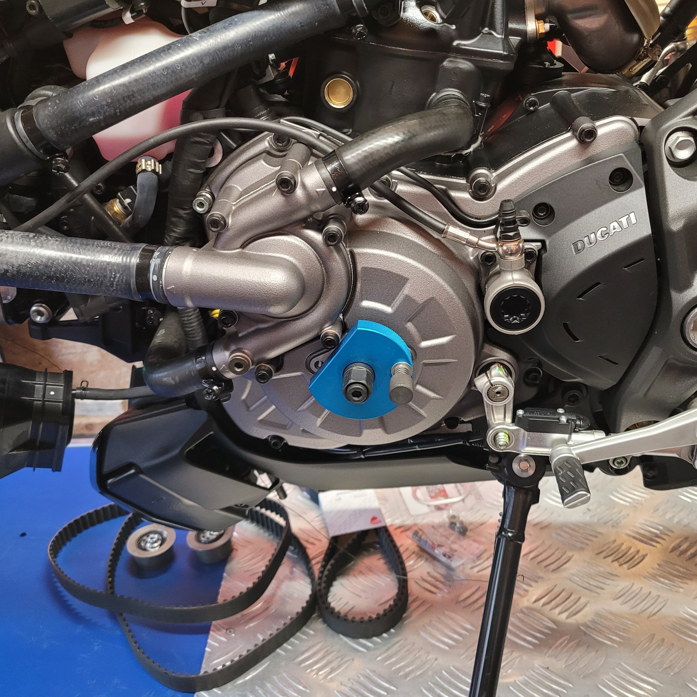 Jetzt kann man die Nockenwellenräder (mit den drei Schrauben) von den Nockenwellen lösen, gegen den Uhrzeigersinn drehen und schön den neuen Zahnriehmen auflegen und spannen...