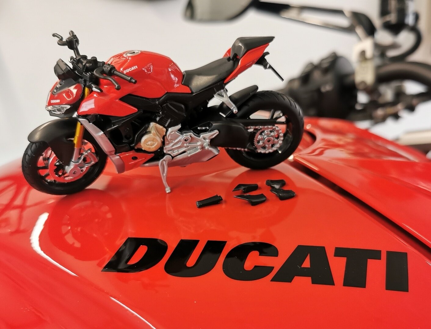 Auch sie verlor sofort die Winglets und büsste 3,7mm Länge des Nummerschildhalters ein. Damit mich die Familie in der Winterpause für beknackt erklären kann, fahre ich damit aufm Schreibtisch umher und mache BrummBrumm mit 107dB. 😂
