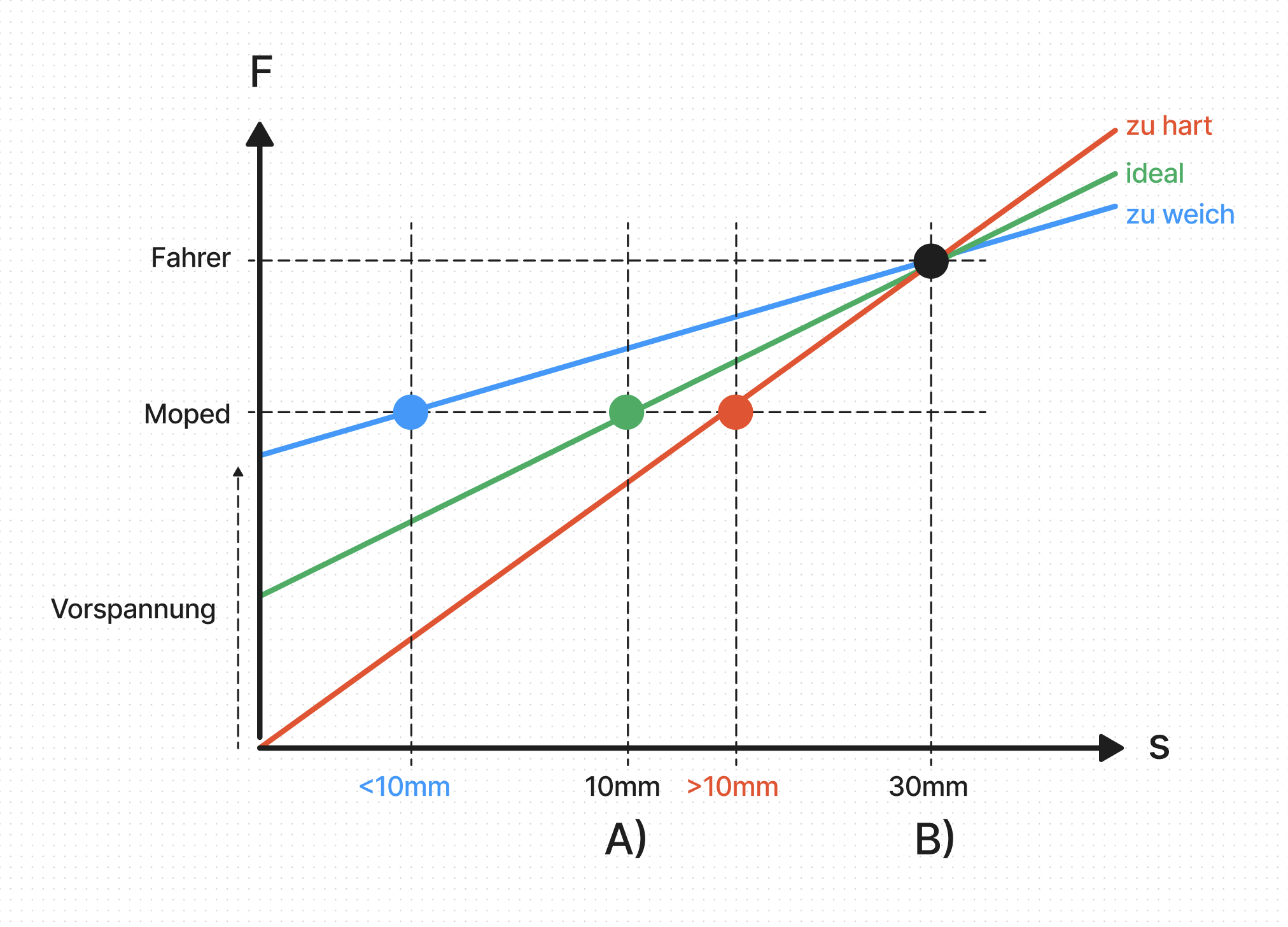 Hab nochmal ne Skizze zur Verdeutlichung gemacht. Es ist nämlich m.M.n. nicht intuitiv zu verstehen, dass man eine härtere Feder benötigt wenn das Moped alleine zu wenig einsinkt. Denn eine starke Feder Vorspannung verschiebt die Federkennlinie nach "oben" sodass du deinen Wert A) mit einer weichen Feder nicht mehr erreichst. Hoffe das macht Sinn 🙂