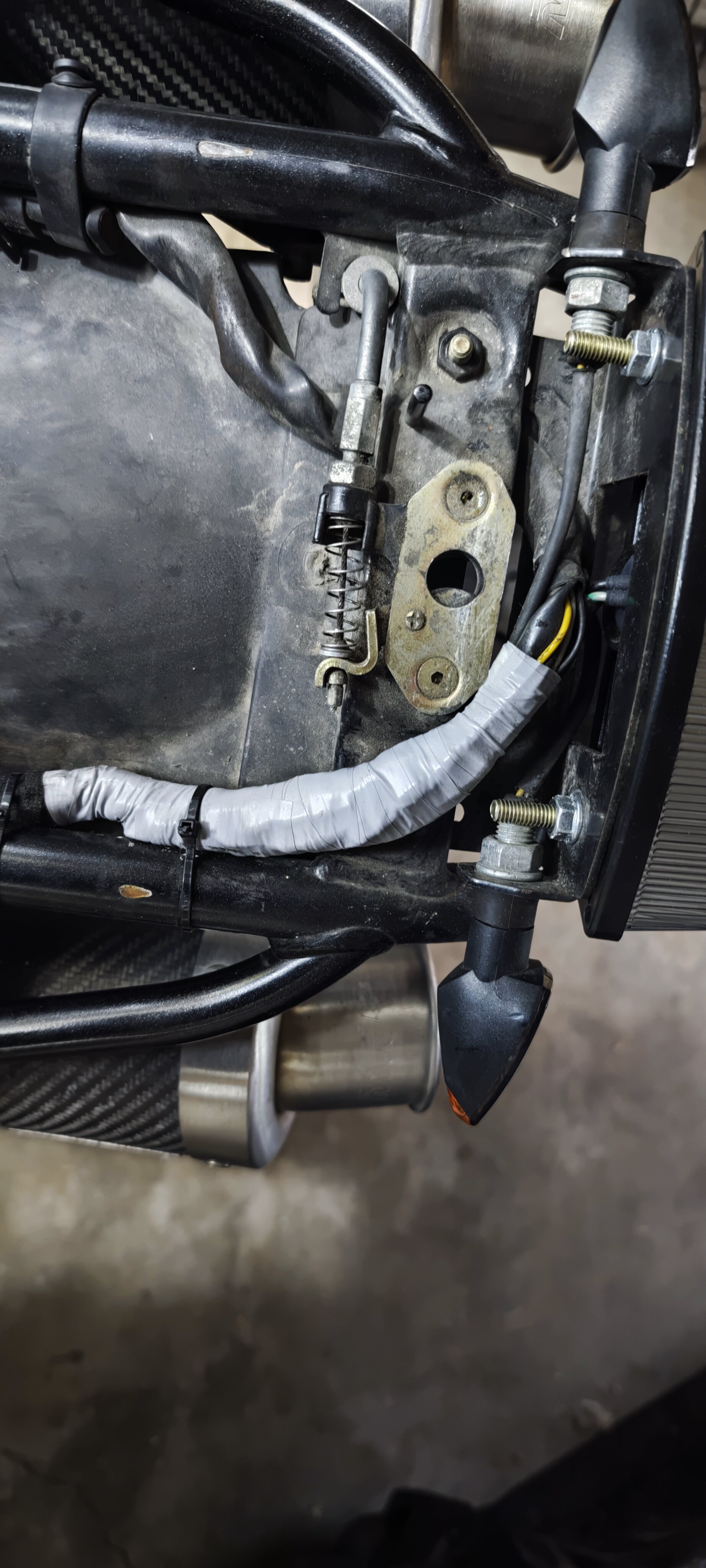 Danach kommen Schwinge und Gabelbrücken zum Pulvern, soll schwarz werden. Hier bin ich noch am überlegen ob ich das Heck mittels der berüchtigten Einschrauber an dem Heckbügel etwas anheben werde. Bin mir nicht sicher ob das viel bringt.