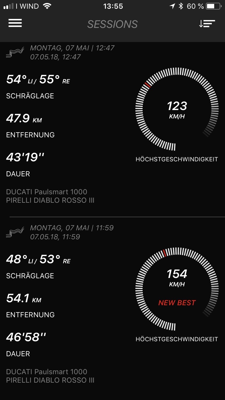 ja genau, ich habe das Pirelli App schon sehr lange. Es gab vor ca 2 Jahren ein Softwareupdate, zumindest kam es mir so vor. Von da weg waren die Schräglagen deutlich geringer. Die erstmessungen lagen bei mir bei Höchstwert 56 Grad, danach kam ich auch nicht mehr über 38Grad hinaus.